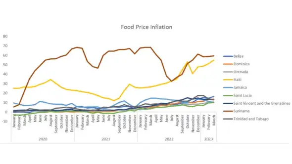 Chart showing food price inflation across the Caribbean between 2020-2023
